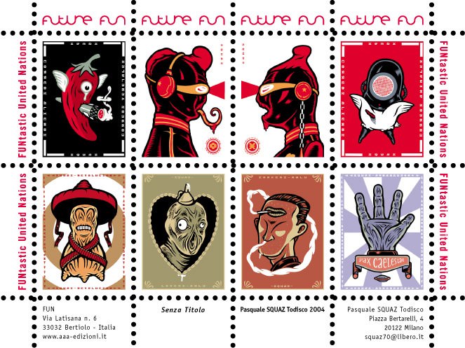 Che c’entrano, a questo punto, i francobolli? Minuscoli rettangolini di carta colorata, dentellati ma non filigranati, osservabili meglio con la lente d’ingrandimento, collezionabili e magari scambiabili come figurine: testimonianze tangibili di un ente ufficiale di emissione, documenti autocertificanti una certa esistenza, viatici di possibile comunicazione tra un qui e un lì, tra un mittente e un ricevente, tra un piano di realtà e un altro. Fondamentali attestazioni di un contratto non scritto tra associati consenzienti alla grande truffa della cui attuazione ci rendiamo complici manifesti. O – prendiamo un altro respiro profondo – finestrelle d’astrospaziotemponave che si aprono su flash immediati di vite lontane e pregne di sorprese morfologiche ma pure ideologiche per non dire narratologiche. Bolli per un certo tipo di passaporto interdimensionale, insomma. E non facciamola più tanto lunga. C’è forse bisogno di spiegare il sabba di colori primari al ritmo space di Helmut King? No, no. Dobbiamo forse interpretare in qualche modo le istantanee di esplorazione del cosmo di Massimo Giacon? Gli faremmo un torto. O valutare gli sgorbionetti geometristi di Ale Staffa? Dio ce ne scampi e liberi! E che dire della galleria di personalità difformi di Mauro Chiarotto? Non oseremmo profferir verbo. E proveremmo forse a descrivere anche solo lontanamente l’altermondo messicaneggiante di Pasquale Squaz Todisco? Ma quando mai! E come censire le forme di vita biancoidi di Miguel Angel Martín? L’operato dei maestri dello spavento è insindacabile. E chi azzarderebbe un commento sul gelido fotobiettivo stratosferico di Massimo Caccia? Nessuno con un minimo di sale in zucca. E si può delucidare il sognante mondo infantile, tutt’occhi, di Shanti Ranchetti? Domanda retorica. Ognuno dei bolli, piuttosto, questo sì, si fa piccolo grande segno di presenza, di monito, di dileggio e di mascherata allegria – come la zeta di Zorro.