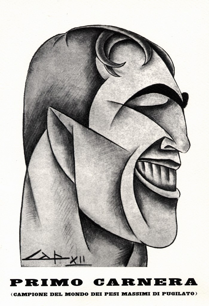 Galeotta fu la boxe, è proprio il caso di dire, per Cleto Capponi. Congiuntura favorevole infatti fu un incontro di pugilato del campione Primo Carnera ad Ascoli: Capponi fece un ritratto del pugile, coniugando una raffinatissima qualità del disegno con i caratteri costitutivi dell’estetica futurista. Il giovane, appena ventiduenne, lo pubblicò sulle pagine locali de “Il Messaggero” ma venne presto notato e spostato in nazionale per poi passare, molto apprezzato dai potenti, a illustrare il Popolo d’Italia, producendo una lunga serie di ritratti dei personaggi di rango dell’epoca. Dalla sua matita nascono due serie di ritratti, “Galleria dei contemporanei” e “Galleria del regime” per la prima e la terza pagina. Da Roosevelt ad Eden fino al sovrano del Siam. Tutti volti passati tramite il processo futurista di scomposizione dei piani e delle linee, ma secondo uno stile personalissimo. L’aspetto fondamentale nei ritratti del giovane futurista risiede nella scelta di ritrarre volti senza utilizzare la componente anatomica, bensì utilizzando quella sovrapposizione di piani e linee che insieme descrivono, combinandosi, fisionomia e psicologia dei soggetti ritratti. Basti pensare alla netta eloquenza del suo “Primo Carnera”.