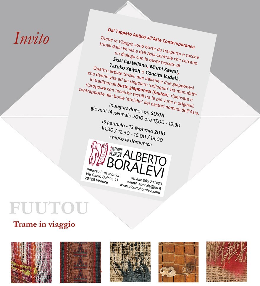 La mostra è la terza di una serie che Alberto Boralevi ha voluto intitolare: ”Dal Tappeto Antico all’Arte Contemporanea” e che vuole indicare come il tappeto, una volta sottratto alla sua funzio-ne meramente utilitaria di complemento d’arredo, possa meglio comunicare ogni sua valenza cul-turale ed artistica. Così dopo i piccoli kilim Shushtar abbinati ai dipinti di lana di Gloria Campriani (Un Filo per Segno, 28 febbraio-20 marzo 2009) e i frammenti di antichi esemplari caucasici con-trapposti alle pecore armate di Fariba Ferdosi (Nodi, 1-21 ottobre 2009), è ora la volta di Trame in Viaggio, borse da trasporto e sacche da tenda tribali dalla Persia e dall’Asia Centrale che cercano il dialogo con le buste tessute di Sissi Castellano, Mami Kawai, Tazuko Saitoh e Concita Vadalà. Quattro artiste tessili, due italiane e due giapponesi che danno vita ad un singolare ‘colloquio’ tra manufatti: le tradizionali buste giapponesi (fuutou), ripensate e riproposte con tecniche tessili tra le più varie e originali, contrapposte alle tradizionali borse ‘etniche’ dei pastori nomadi dell’Asia.