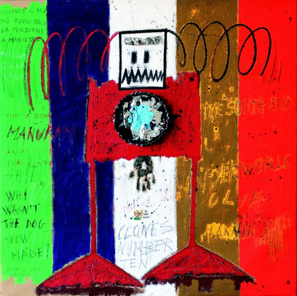Il comune denominatore di tutti i dipinti è la gamma cromatica, non eccessivamente ampia, colori primari e ben vivaci; luminosi senza risultare stridenti, essi risaltano decisamente anche in virtù di opportune combinazioni, giocando con il contrasto dei toni, rafforzando il peso delle forme rappresentate nello spazio compositivo, configurate non solo per l’applicazione della tinta ma anche per l’aggiunta di cartoni, tappi a corona, ritagli metallici, tele, sacchi, sabbia, argilla, e un’infinità di indicazioni che completano il trattamento con acrilici pigmentati.