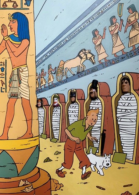 nel suo testo critico, evidenzia come l’artista “santifichi” i suoi personaggi. Tintin ad esempio,