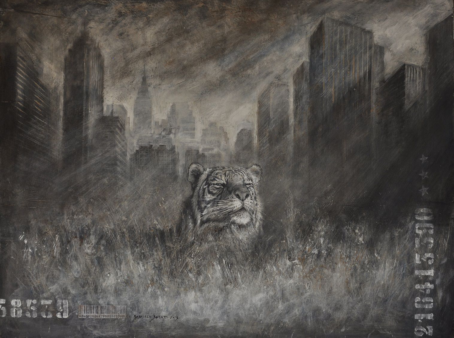Gabriele Buratti inserisce i suoi animali (elefanti, tigri, zebre, iene, lupi) in metropoli urbane, non-luoghi, dove le anime umane sono invisibili, disperse, totalmente assenti. Anche i pochi colori utilizzati (bianco, nero, grigio, terra, ruggine) delle vernici, miste ad olio, creano un paesaggio rarefatto, quasi spettrale, in uno stile riconducibile alla fotografia.
