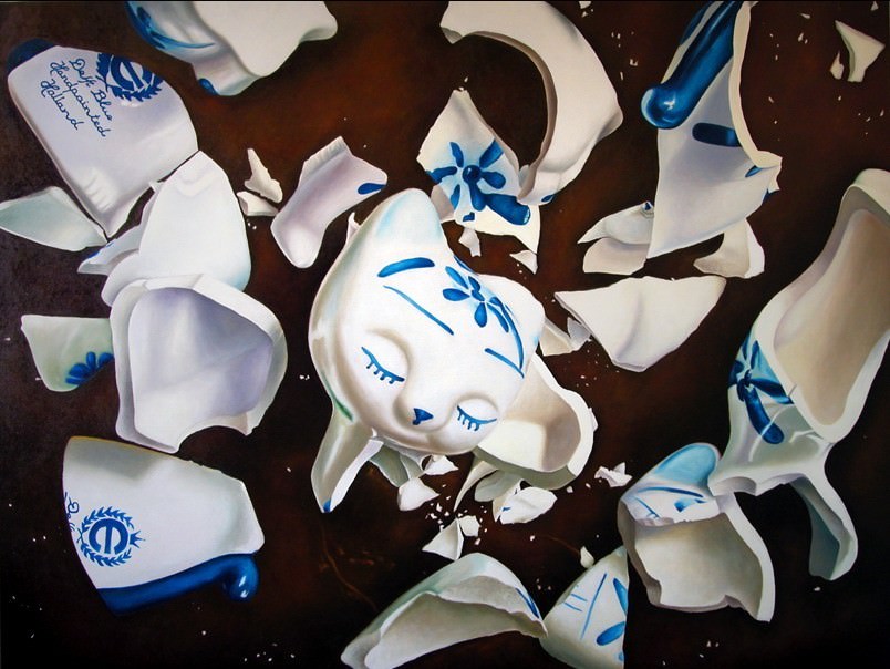 Tutto questo viene detto nella maniera sorniona e affabulatoria della pittura di Gabriele Lamberti, che ci presenta una serie di ninnoli di Delft (avete presente quei souvenirs di ceramica bianca e blu che si acquistano in Olanda?) andati in pezzi.