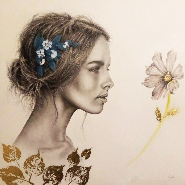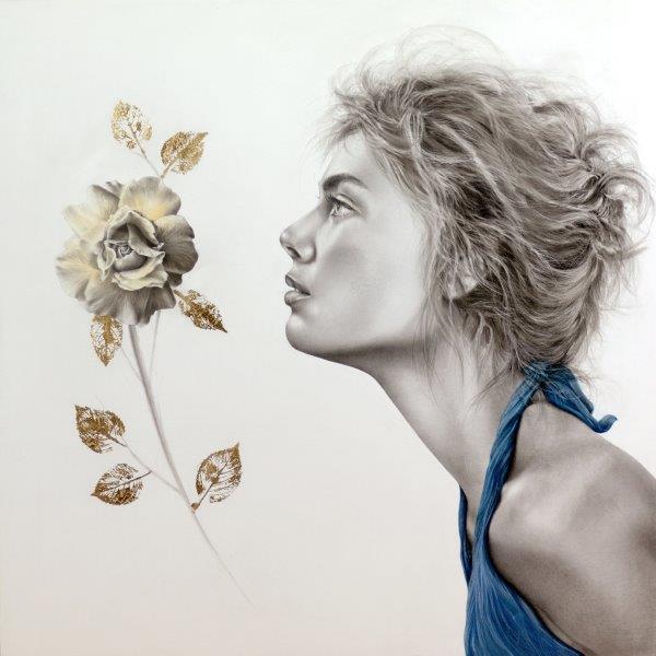 Da una parte ci sono una serie di ritratti di grande formato di ”fanciulle in fiore”: bellissime e giovani ragazze per lo più intente ad ammirare un fiore o ad annusarne il profumo. O forse a rispecchiarsi “metaforicamente” in esso. Si tratta di vere e proprie ninfe contemporanee, novelle apparizioni allegoriche di una Primavera che anziché uscire dallo studio dl Botticelli, paiono arrivare direttamente da uno shooting in via Tortona e ci trasmettono una sensazione di radiosa e giocosa vitalità e di sensuale elegante bellezza: volti, spalle, braccia, mani e fiori che galleggiano su fondi bianchissimi di pura luce, con talvolta qua e là il balenare di foglie di foglia d’oro. Figure luminose e numinose, la cui bellezza ci appare così assoluta da assurgere necessariamente a simbolo di una “Primavera” che quest’anno abbiamo visto esplodere solo da lontano, fuori dalle finestre o dai balconi, mentre eravamo tutti rinchiusi in casa per la quarantena. Oppure simbolo della rinascita di questi giorni o che si spera arrivi in giorni prossimi venturi.