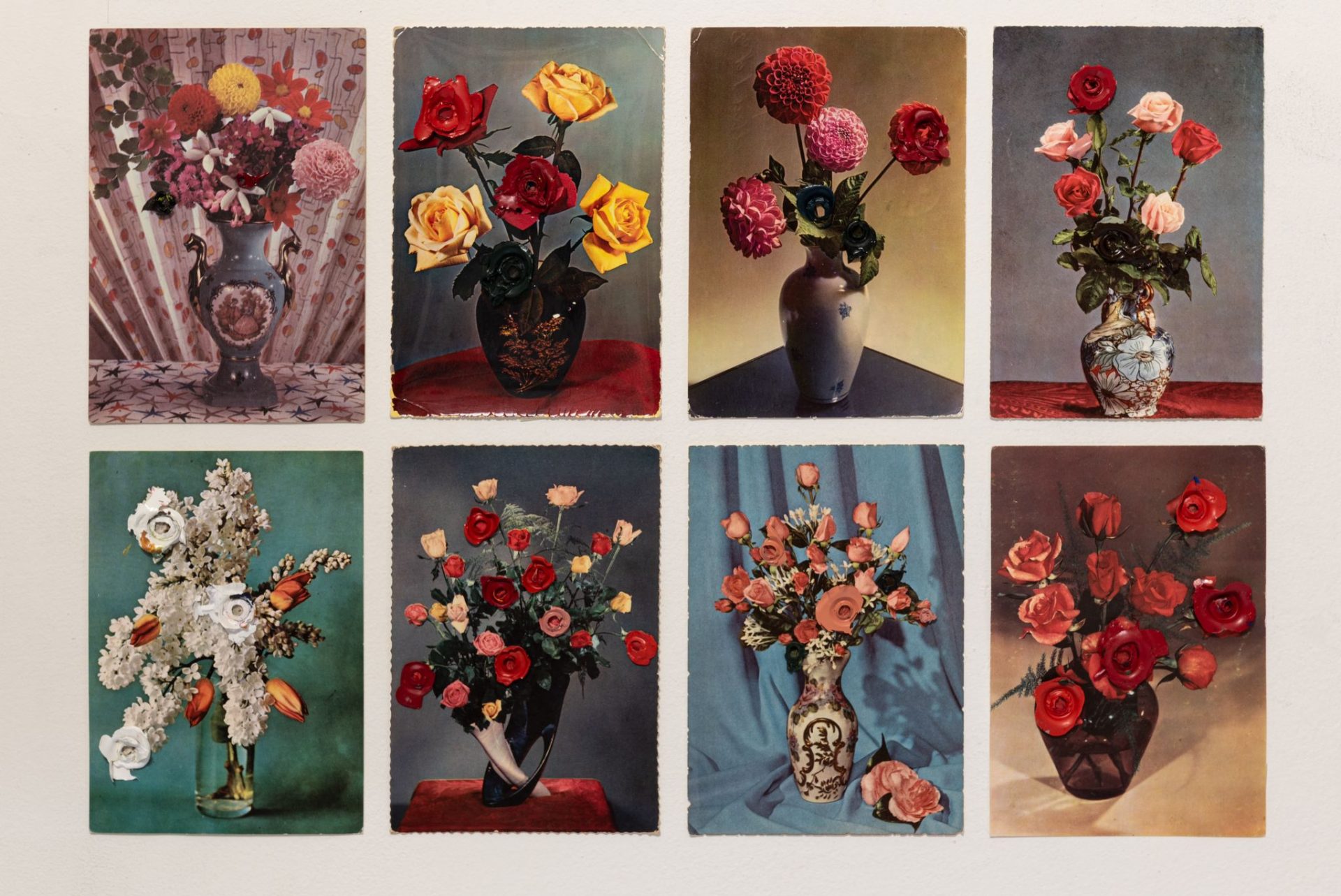 Annota Franco Speroni nel suo testo critico: «Esposte assemblate in gruppi, incorniciati dal vuoto eloquente delle pareti della casa, le cartoline creano ora macchie colorate, dove cercare la “propria”, quella che sceglie chi la guarda, perché crea una relazione affettiva seppur effimera, riproponendo così il senso di quell’operazione più vasta che è l’arredare: assemblare cose, tanto ovvie nel loro significato funzionale quanto è oscura la forza fantasmagorica sentita da chi le ha volute. Sulle cartoline, i dettagli dei vasi decorati, come le forme dei fiori, vanno cercati con la “lente” per cogliere la differenza attraente nell’apparente ripetizione, come ha fatto lo stesso autore che ha interagito con esse, apponendovi una sorta di piccolo sigillo pittorico – macchie di colore essiccato – che si mimetizzano con i fiori della stampa».