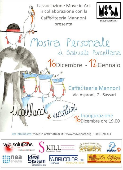 Gabriele Porcellana, sassarese, ha esposto in questi anni, in diversi spazi cittadini. Caffè, negozi, convegni, luoghi spontanei frequentati dalla gente al di là della retorica, e dei conformismi, del vernissage. Portare l’opera d’arte tra pubblici differenti risponde ad un’esigenza non solo di democrazia culturale ma all’esigenza estetica di restituire i materiali, strutturati in forme e in colori al sentire comune degli uomini e delle donne, principale ispiratore dell’opera del Porcellana.