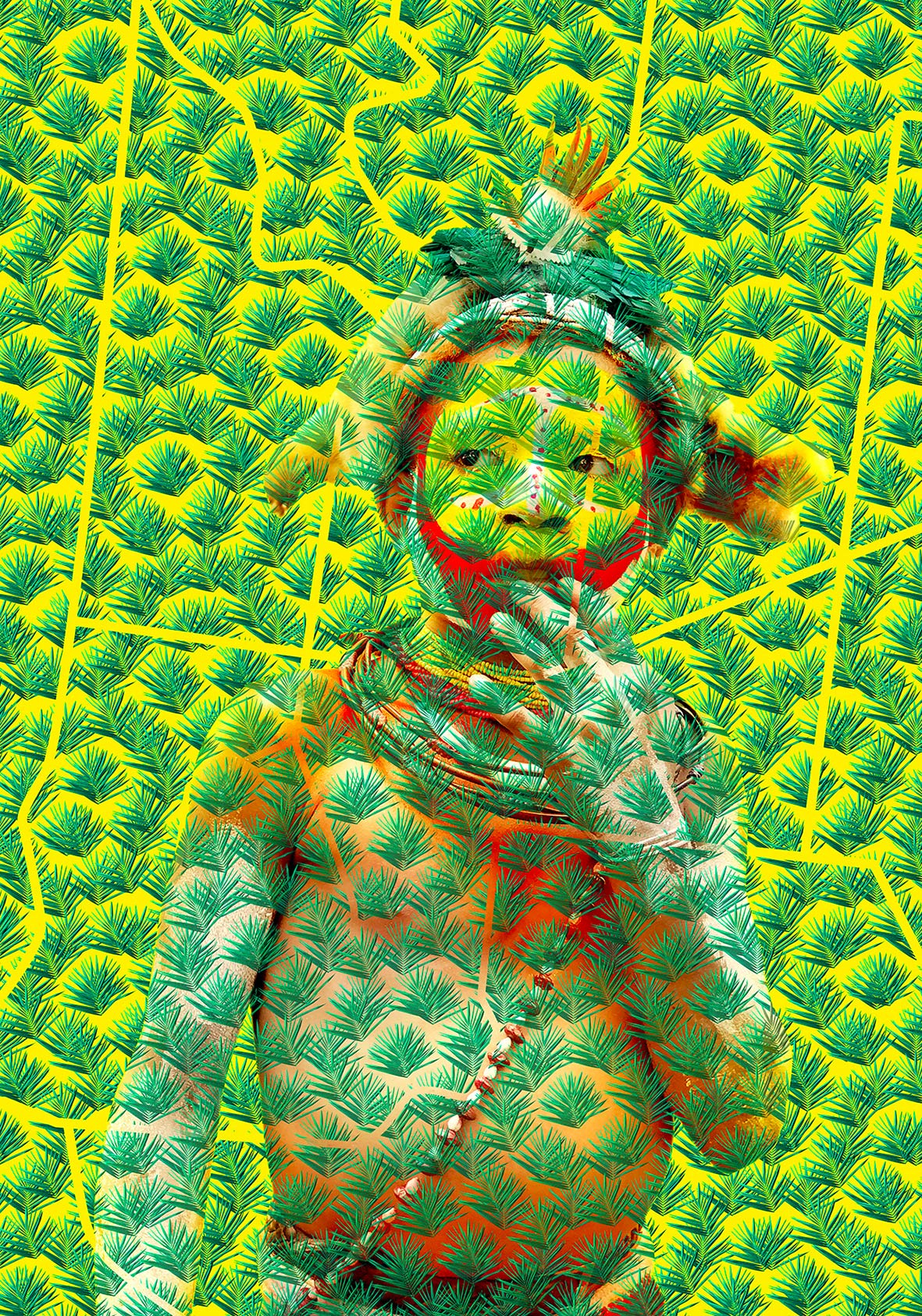Nello specifico della mostra “Disantropica” le persone raffigurate appartengono ad alcune delle tribù della Papua Nuova Guinea che maggiormente subiscono le conseguenze della globalizzazione. La serie inedita “Destino Manifesto” fa riferimento allo sfruttamento intensivo delle terre legato alla produzione dell’olio di palma che sottrae sempre più spazio agli indigeni, sostituendo la foresta primaria con un ambiente artificiale. Le figure risultano invase da una texture dai colori innaturali, soffocate da questa natura sintetica che si sta creando. Nel caso della serie “Colors Still Remain” si procede con una totale sottrazione e dematerializzazione dell’individuo stesso. Il corpo quasi si dissolve, si estingue, rimane solo la sintesi dei colori, delineati e dirompenti.