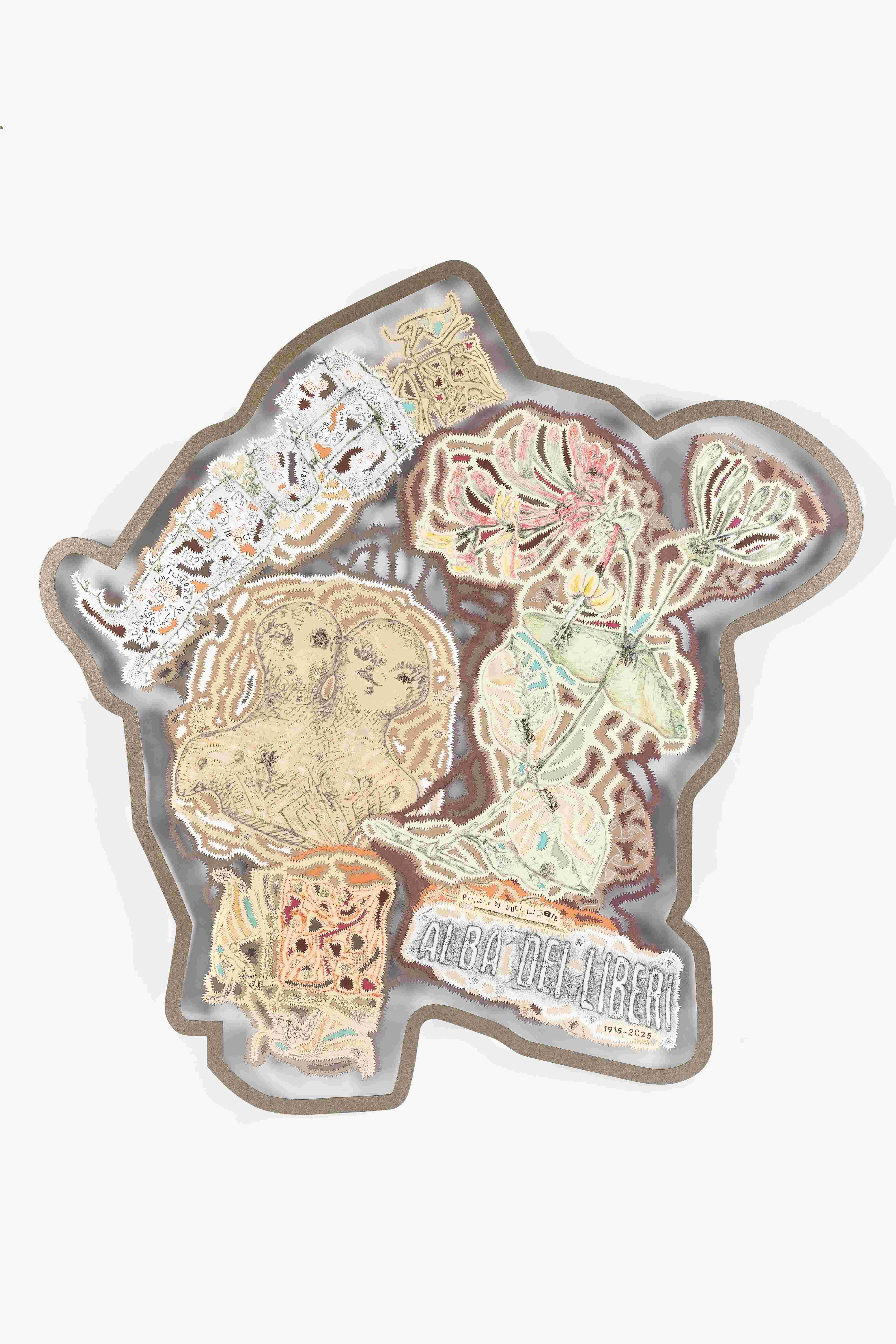 L’Alba dei Liberi – spiega l’artista - è una nuova serie di disegni in cui intreccio piante “curative” con alcuni reperti archeologici scoperti da Marija Gimbutas (1921-1994), archeologa lituana, nota per le sue teorie sulla Dea Madre e le culture preistoriche europee, con particolare attenzione al Mediterraneo. La ricerca dell’archeologa rappresenta un nuovo approccio allo studio della preistoria e la scoperta di una civiltà europea alternativa, da lei definita con Il termine gilania, coniato insieme alla sociologa e attivista statunitense Riane Eisler. La tecnica utilizzata è la sovrapposizione di diversi livelli grafici: utilizzo diverse carte tagliate a scalpello su cui disegno con matite, acquerelli e acrilici, aggiungendo texture realizzate con inchiostro e bottoni metallici usati come timbri. Questa sovrapposizione – sottolinea - è il mio modo di creare una metafora per quelle stratificazioni che costituiscono la base della creazione di una nuova cultura.
