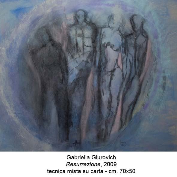 Il colore, la luce e il sentimento sono protagonisti della pittura di Gabriella Giurovich - scrive Accerboni - racchiusi in un’arte di riflessione e nel contempo di slancio: riflessione nei confronti della vita in senso lato e in senso contemporaneo, in cui protagonista costante è la figura umana, spesso raccolta in gruppi. Attraverso tale modulo, che si ammanta di un gesto pittorico liberissimo e convincente, di matrice espressionista, la Giurovich affronta temi toccanti e di forte impatto emotivo come per esempio la Shoah, simbolizzata da corpi che escono dal fuoco o sono prostrati nel dolore: una visione che potrebbe risultare totalmente apocalittica, se il raggio di luce che caratterizza di consueto la sua pittura, non illuminasse l’azione e l’atmosfera, donando a quest’ultime il coraggio della speranza.