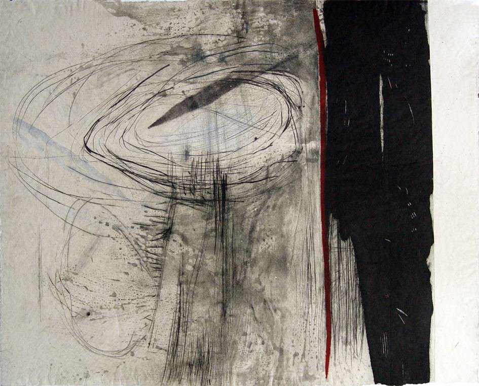 Come una moderna alchimista Gabriella Locci mescola carborundum e punta secca, acqua tinta e acqua forte su alluminio e rame, inseguendo gli spazi per scoprire sentieri nascosti e sperimentare nuove formule. Contaminazioni che diventano segni graffianti, percorrono con determinazione la materia, illuminandola qua e là di rossi decisi, neri spessi che degradano lentamente fino al grigio. Percorsi artistici che si stagliano sul bianco del foglio fino a plasmare lo spazio intorno. Una continua invenzione, un gioco tra l’artista e i suoi materiali in un rapporto dialettico che evolve di continuo. I segni incisi raccontano così percorsi dell’anima ed esperienze che vengono da lontano. Una realtà necessaria che rivela l’artista che non ha paura di raccontare l’invisibile.