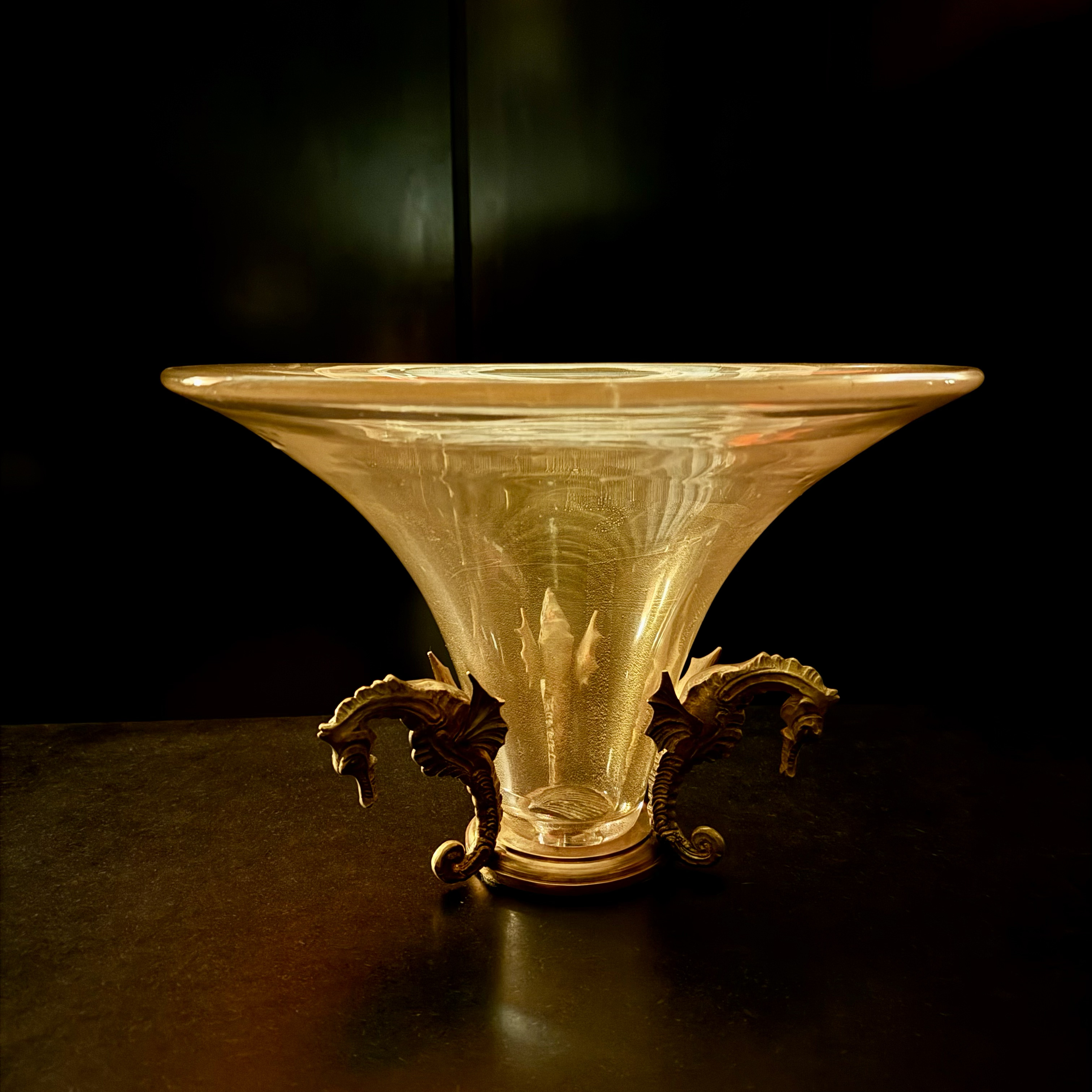 Come ha colto Cristina Beltrami, curatrice e storica dell’arte, che ha steso un testo per questa mostra, “le forme pulite delle coppe più classiche, quelle in particolare dei nomi da lei più amati, come Giacomo Cappellin e Vittorio Zecchin, trovano una nuova collocazione montate su strutture zoomorfe in bronzo dorato”. Mentre il rimando al mondo marino è ancora una volta un richiamo alla natura marinara di Venezia o, per usare le parole di Joseph Brodsky: simile a quell’ora così tarda a un'immensa scogliera corallina