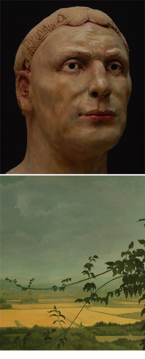 Gaetano Giuffrè, che è figlio di Guido, ci trasporta in un mondo lontanissimo da quello del padre: anzitutto perché è uno scultore, che s'impone con altro stile all'attenzione del visitatore. Le opere di Guido bisogna andarle a scoprire, e possono passare anche inosservate ad un pubblico disattento; le opere di Gaetano, appena le vedi ti smuovono qualcosa dentro, e non ti lasciano mai indifferente: potrai esserne attirato o respinto, ma non le dimenticherai facilmente. Sono figure, torsi umani, corpi contorti e compatti nello stesso tempo, modellati con grande maestria da un artista che sa maneggiare come pochi l'argilla, portandola ad una tale finitezza formale da farla sembrare quasi preziosa; ma si intuisce che al fondo di questi lavori c'è qualcosa di drammatico. Gaetano instaura un rapporto conflittuale con i suoi soggetti e la sua materia: è una specie di corpo a corpo dal quale le figure escono spesso stravolte, i visi gonfi e ammaccati come certi autoritratti di Bacon. Nell'equilibrio compositivo tuttavia le tensioni interne di queste figure trovano un loro estatica dignità.
