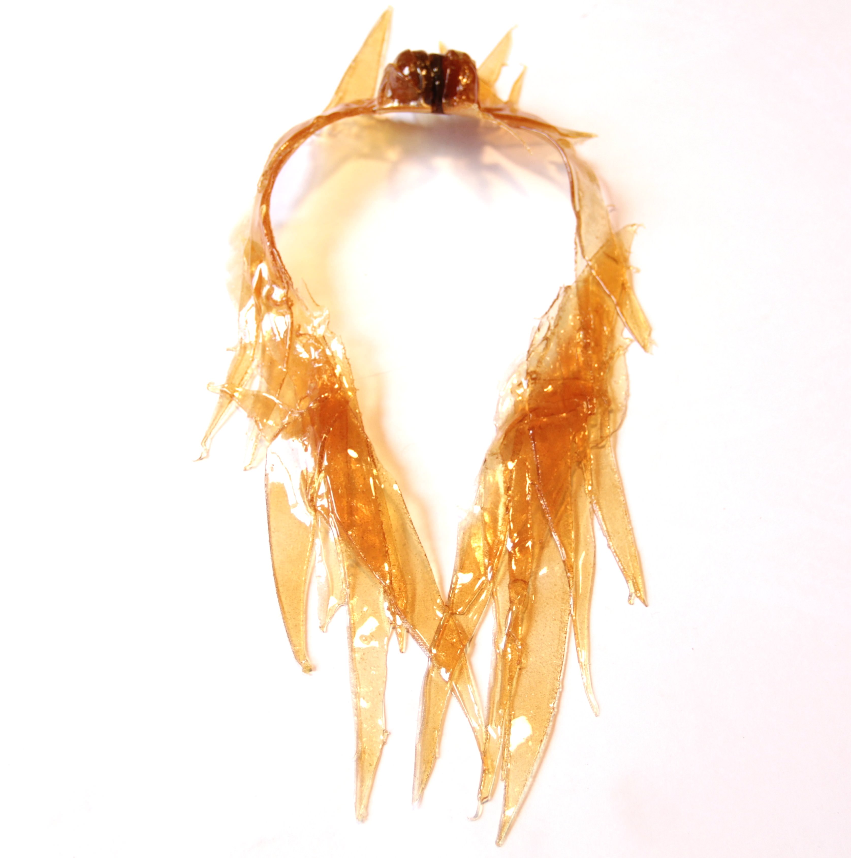 I bracciali, le collane e le spille realizzate in resina poliuretanica, si nutrono di trasparenze ambrate e lamine colorate