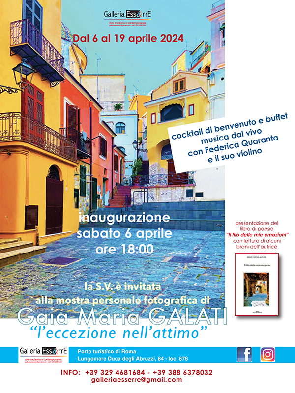 Nella spettacolare passeggiata del Porto turistico di Roma nella Galleria Ess&rrE si inaugura il 6 aprile 2024 alle ore 18:00 la mostra L’ECCEZIONE NELL’ATTIMO, mostra fotografica personale di Gaia Maria Galati.