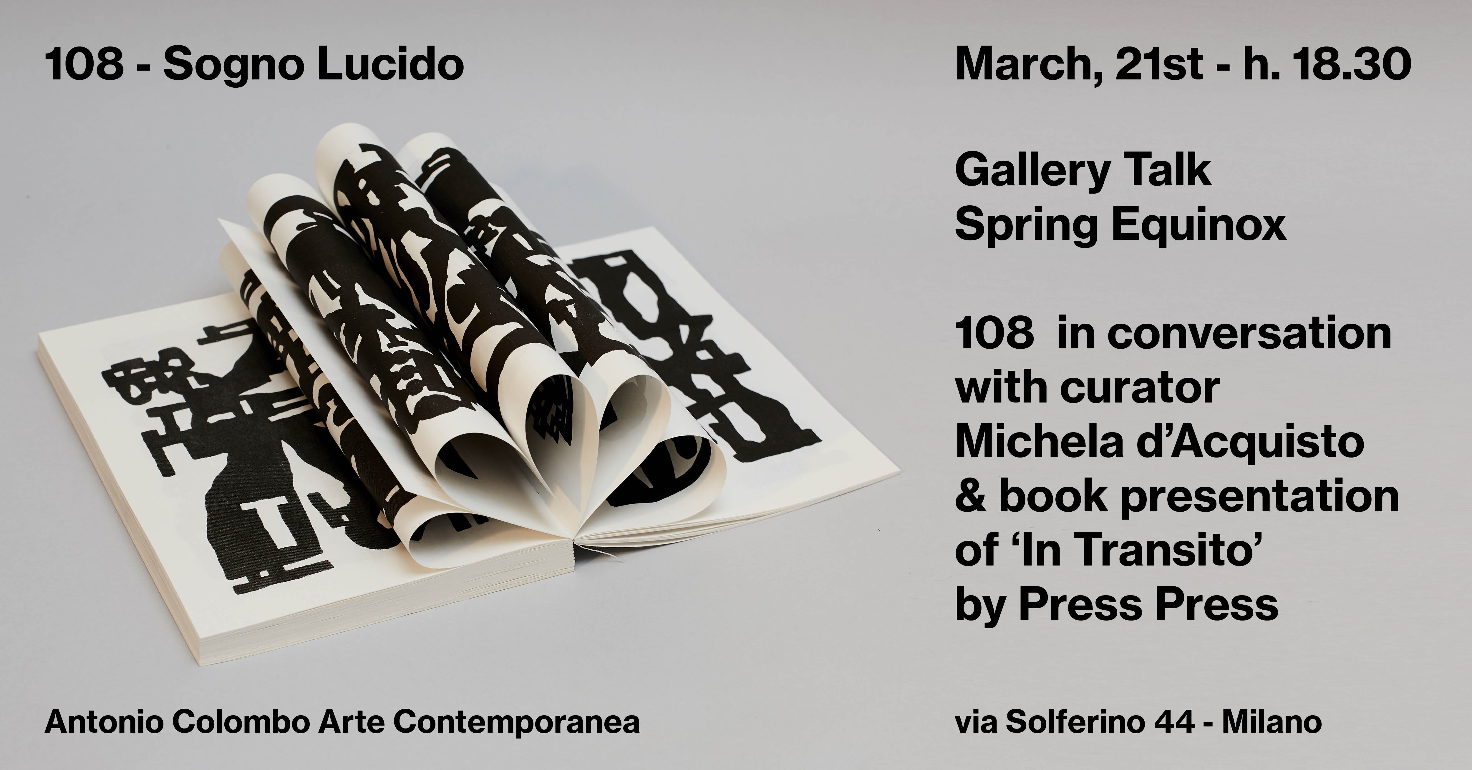 In occasione dell’equinozio di primavera, la galleria Antonio Colombo Arte Contemporanea ospiterà una conversazione tra l’artista 108 e la curatrice della mostra attualmente in corso, Michela D’Acquisto. A seguire, presentazione della nuova monografia In Transito, edito da Press Press.
