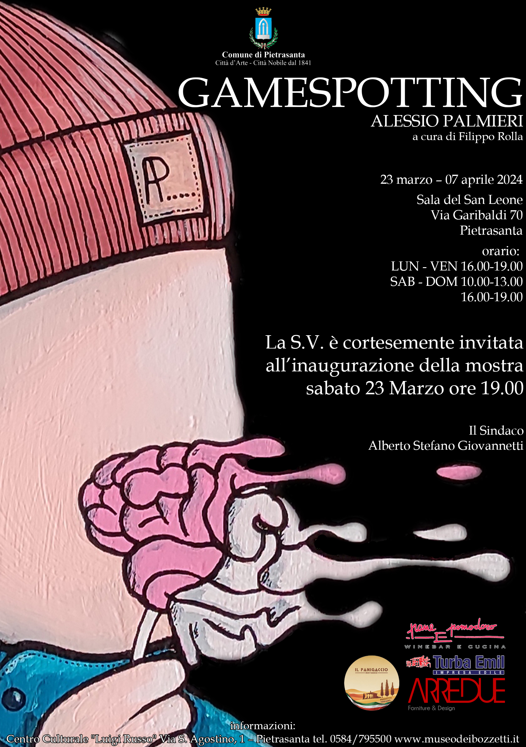 Gamespotting di Alessio Palmieri, mostra personale a cura di Filippo Rolla, è una rivisitazione pittorica e scultorea del contemporaneo, di ciò che ogni giorno accade nel mondo o dietro l’angolo, quando magari non ce ne accorgiamo o quando per indifferenza chiudiamo un occhio. Una rappresentazione di ciò che in tempo reale vediamo ed ascoltiamo in televisione, alla radio, sui socials perché viviamo tutti nel solito “villaggio globale”.