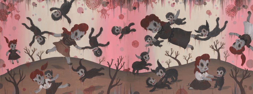 I nuovi dipinti e i disegni della serie “Vicious” si dividono in due categorie, da una parte i paesaggi e dall’altra i ritratti di ragazze con bizzarre creature pelose.