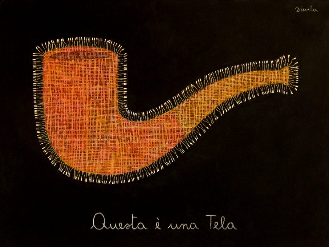 Più che conosciuta la frase “Ceci n’est pas une pipe” e la perentorietà delle parole che la compongono. Il dipinto di Magritte, a cui la frase si riferisce, raffigura una pipa, ma non la si può prendere e usare per fumare perciò non è una pipa. Nel momento in cui io, Feliscatus, dipingo una pipa che ha la struttura in apparenza ed è fatta nella sostanza di tela, guizza un interrogativo che vira subito in certezza. L’oggetto dipinto ha la forma riconoscibile di una pipa ma si capisce che essendo di tela non è da utilizzare per fumare, se tentassimo di avvicinare ad essa il fuoco brucerebbe e sparirebbe; alla pipa di tela dipinta non chiediamo perciò questo requisito, di svolgere cioè la sua funzione di pipa ma di rimanere ancorata alla pura esistenza estetica. Assodato ciò, andando avanti nella lettura del quadro si può vedere che le parole scritte sotto la pipa dicono “Questa è una tela”. Qui sorge un altro tipo di ambiguità dai contorni assai sottili: se chi legge queste parole pensa che siano rivolte alla pipa può dire che quella è una tela dipinta e non una tela e potrebbe aver ragione. Ma io potrei anche affermare che quelle parole indicano la tela (vera) su cui le parole sono scritte (anche quella che sta sotto la pipa dipinta) e allora non ci sarebbero più appigli per alcuna ambiguità: il supporto del dipinto è una tela.