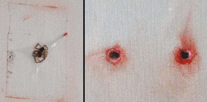 Quella che si vede e sente nelle prime battute è una bruciatura su un piano di truciolato nobilitato di grandi dimensioni con attaccati qua e là, a mo’ di stelle quadre, feltrini autoadesivi. La forma di questa bruciatura è quella di una bocca spalancata seguita da una scia di sangue coagulato.
