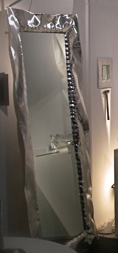 E sono proprio gli specchi dell’artista Marco Mazzei protagonisti di tale riflessione, vere e proprie opere d’arte che incontrano il Design. Lo scultore pescarese realizza i suoi specchi utilizzando lastre di alluminio la cui lavorazione nasce dall’analisi e dalla reinterpretazione dell’antica arte dello Sbalzo e Cesello. Tale tecnica utilizza il martello e a cuni utensili con cui viene traferito il colpo dal martello sulla lastra di metallo.