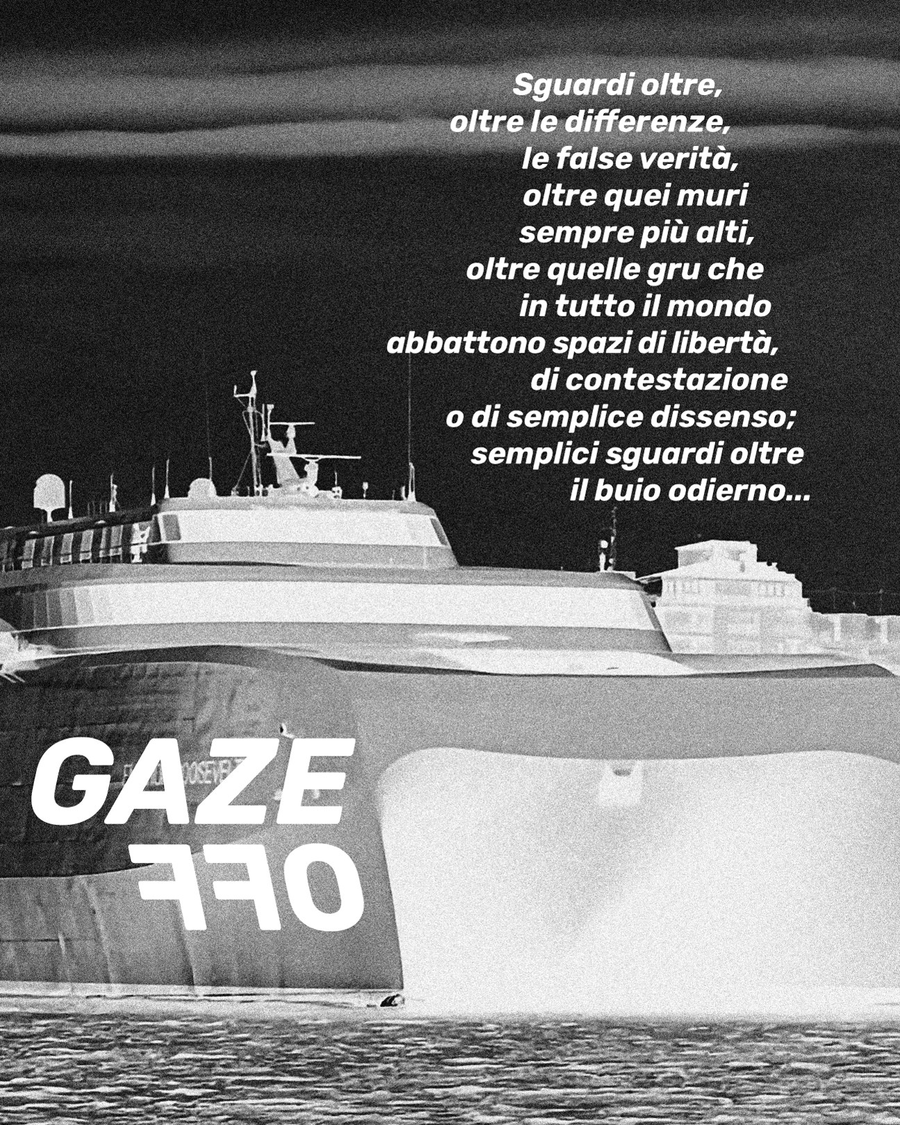 GAZE-OFF non è una mostra, ma è AZIONE collettiva, è performance, è spazio proattivo e dinamico, aperto all’incontro e al confronto, all’interazione, critico e costruttivo, dove la Cultura, in tutte le sue forme, torna ad essere, oltre che Protagonista, Responsabile cosciente di quella luce, sempre più fioca, che potrebbe riaccendere nell’immediato speranze, sguardi, visioni.