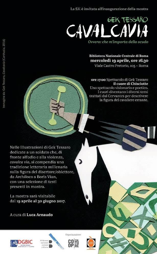 Mercoledì 19 aprile, alle ore 16,30, la Biblioteca Nazionale Centrale di Roma inaugura una esposizione di 40 opere su carta di Gek Tessaro, tra i più affermati illustratori a livello internazionale, Premio Andersen 2010, ideatore di un originale teatro disegnato. Attraverso una combinazione di immagini e testi, la mostra Gek Tessaro. Cavalcavia. Ovvero: che m’importa dello scudo, organizzata da BNCR e CoopCulture e curata da Luca Arnaudo, è dedicata al tema attualissimo del rifiuto della guerra (visitabile dal 20 aprile al 30 giugno, lun-ven 10-18, sab 10-13). L’apertura dell’allestimento sarà impreziosita alle ore 17,00 dallo spettacolo di Gek Tessaro Il cuore di Chisciotte, tratto dal suo omonimo libro: una libera rivisitazione dell’immortale personaggio di Cervantes, in un percorso di suggestioni liriche sul tema dei cuori in viaggio e sulla scoperta di sé stessi.