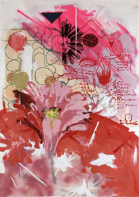 cui si sprigionano colori decisi, forme astratte, pennellate dense, contaminate da segni e
