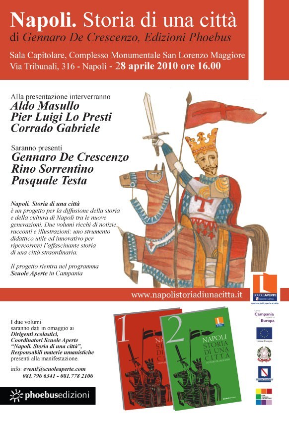Sarà presentato il 28 aprile 2010 ore 16, nella Sala Capitolare del Complesso Monumentale di San Lorenzo Maggiore nel capoluogo campano (via Tribunali, 316 - Napoli ), l'opera editoriale “Napoli, storia di una città”. Un contributo alla memoria in una metropoli straordinaria che ha bisogno di ritrovare le proprie radici per guardare al futuro. Un utile tassello didattico per riscoprire 2500 anni di archeologia, arte e tradizioni, realizzato da Gennaro de Crescenzo ed edito dalla “Phoebus”. Alla presentazione saranno presenti Gennaro De Crescenzo, autore del libro, Rino Sorrentino, illustratore dei volumi e Pasquale Testa, editore della casa editrice Phoebus. Interverranno il filosofo Aldo Masullo, il dirigente della Regione Campania Pier Luigi Lo Presti e l'assessore uscente all'Istruzione, formazione e lavoro della Regione Campania, Corrado Gabriele.