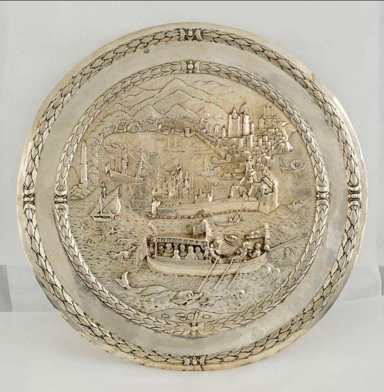 La ritrovata placca in argento sbalzato raffigurante Un barcheggio di nobili sullo sfondo della veduta della città di Genova, opera di un argentiere fiammingo dell’inizio sec. XVII, è esposta a confronto con due opere fondamentali per illustrare la sua eccezionalità come seicentesca raffigurazione della città vista dal mare e la singolarità della presenza di una barca “lusoria”, cioè usata per il divertimento, sulla quale un gruppo di dame e cavalieri sta brindando.
