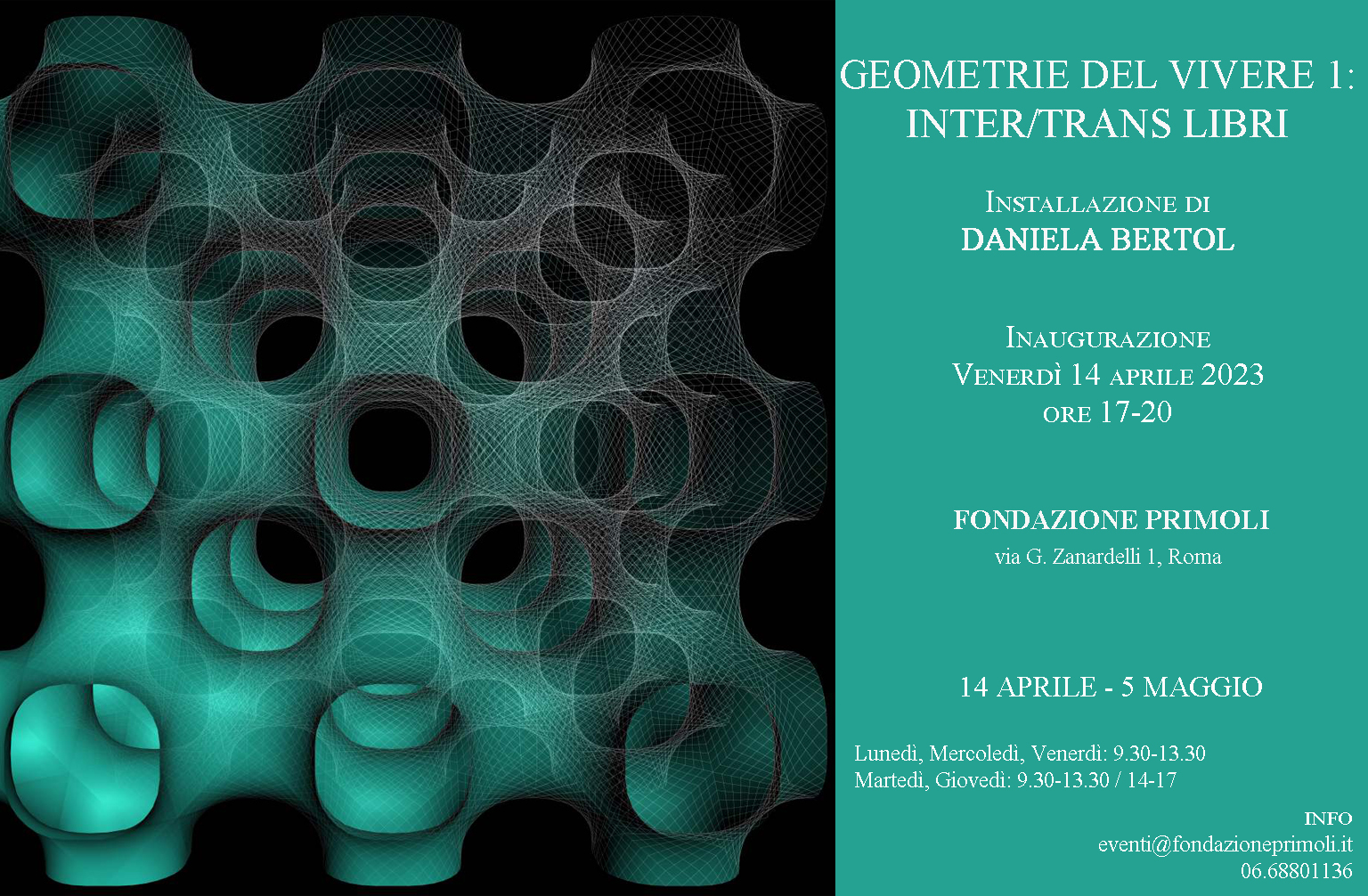 La biblioteca della Fondazione Primoli ospita una mostra / installazione di Daniela Bertol, la prima della serie Geometrie del Vivere, presentazione visiva di lavori multimediali e transdisciplinari sul rapporto tra geometria, architettura e corpo.