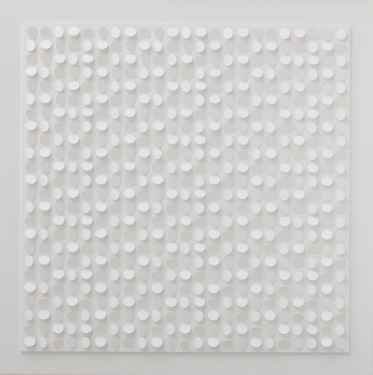 Muovendo da un nucleo di opere realizzate sul finire degli anni Sessanta (si pensi alle straordinarie Superfici interattive del 1968 e alle Rotazioni del quadrato realizzate nel 1969), periodo in cui Claudio Rotta Loria orienta il proprio discorso sul colore, sulla forma geometrica, sulle forze e sui dati elementari della pittura intesa come atto mentale, l’esposizione evidenzia il modus operandi di un intellettuale totale che dilata l’orizzonte riflessivo e creativo nell’ambito di importanti considerazioni sulla luce, portata a ingrediente essenziale del lavoro e a fattore capace di innescare mobilità, cinetismo controllato da regole di natura temporospaziale. Agli anni Settanta risalgono infatti le Strutture reticolari complesse a pluripercezione (1970) e i Cromoplastici (1970) dove la fluorescenza cromatica porta l’osservatore a percepire accurati effetti di vibrazione, seguiti dalle Superfici a interferenza luminosa (1970) dove Rotta Loria esplora analiticamente l’azzeramento percettivo della carta (importanti, di questo periodo, anche i vari interventi plastici nello spazio della vita – si pensi almeno all’Intervento d’ambiente Q 1.0 del 1970 e alla Porta del cielo del 1972) e dalle varie spazializzazioni di forme geometriche (1971) che estroflettono lo spazio perfetto della superficie per dar luogo a dispositivi vibranti, a programmazioni visuali capaci di sollecitare l’occhio del fruitore e di risucchiarlo in un ambiente geometrico dall’immota mobilità.