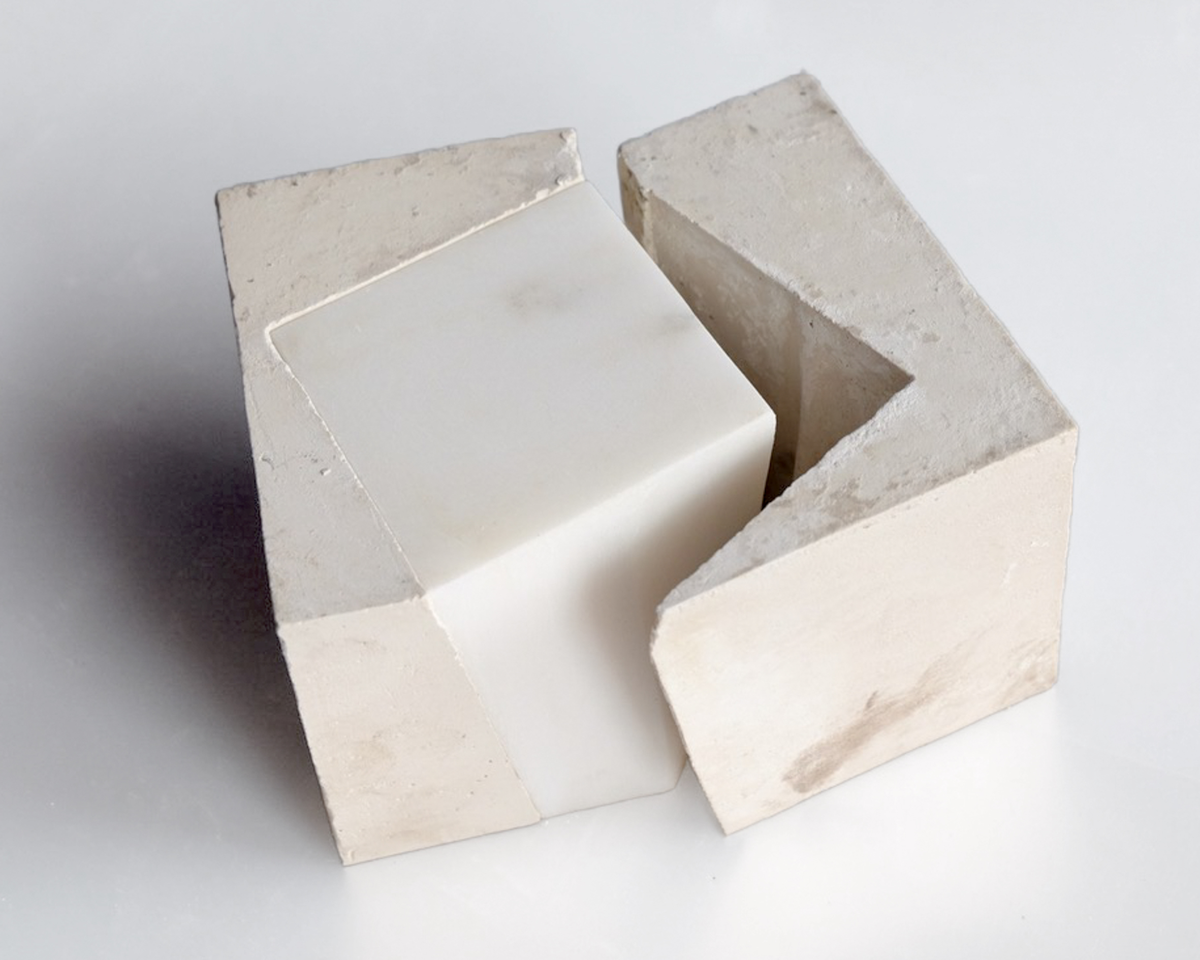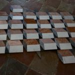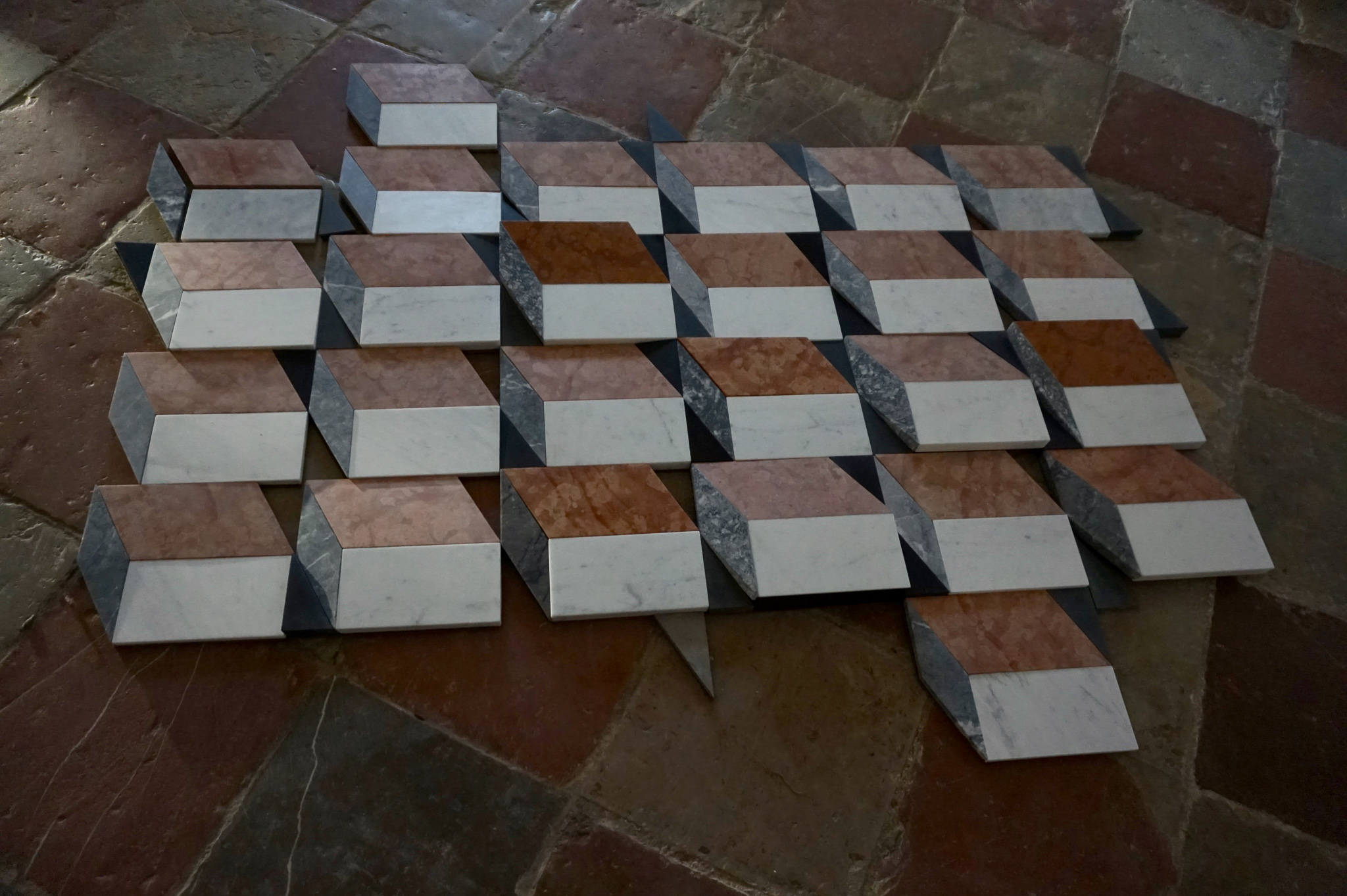 Alberto Fiorin insegna Tecniche del Marmo e delle Pietre Dure presso L’Accademia di Belle Arti di Venezia ed è specialista del restauro di opere in marmo, con commissioni da parte di prestigiosi musei. Fiorin espone in Santa Maria Assunta, Opus Sectile, una scultura a terra che riprende le armoniose organizzazioni pavimentali di chiese e palazzi antichi, il cui gioco prospettico distorto mette in discussione le nostre regole di visione acquisite. Tale scultura è posta in relazione con un massiccio blocco grezzo di marmo di Carrara retto alla base da quattro solidi, sculture in marmo di diversi colori, scolpite con eleganza e raffinatezza ma che, fungendo da basi per il grosso blocco, sono celati al nostro sguardo. Come simbolici pilastri di senso dell’esistenza, l’essenziale, invisibile alla nostra vista, va cercato col cuore e le risonanze interiori. Alle pareti due pannelli con disegni mostrano il percorso mentale di sviluppo del progetto e degli accorgimenti tecnici per la sua realizzazione. Nell’oratorio di Villa Simion Mirijam Heiler espone una serie di delicate opere pittoriche definite “Opere d’astrazione geometrica che parlano di paesaggi commoventi, esperimenti di poesia visiva che danno parola alla voce silenziosa degli alberi, direttrici e linearità provenienti dagli oggetti più comuni che consentono l’emersione sul supporto di liriche