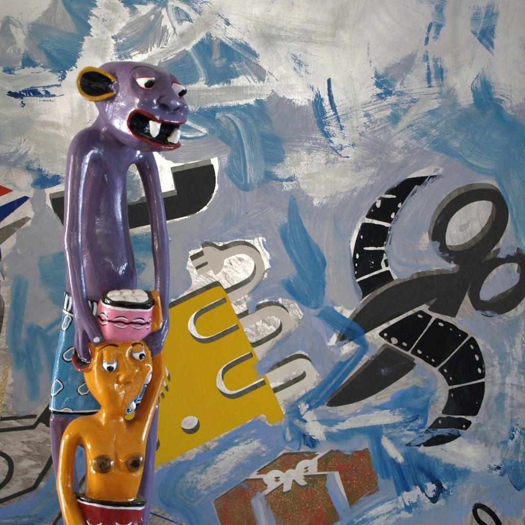Ugo Nespolo, George Lilanga, un incontro casuale dovuto alla scoperta e all’innamoramento da parte dell’artista piemontese per le opere dello scomparso artista africano. Un amore provocato dal suo vivacissimo cromatismo, dalle scene di vita di villaggio piene di voglia di vivere e di continui movimento e ritmo, rappresentate attraverso le immagini degli Shetani, i diavoli della tradizione Makonde che Lilanga ha trasformato in spiritelli gioiosi. Nespolo ha subito apprezzato anche i materiali di recupero utilizzati da Lilanga, la masonite, la faesite, le pelli di capra, i legni.