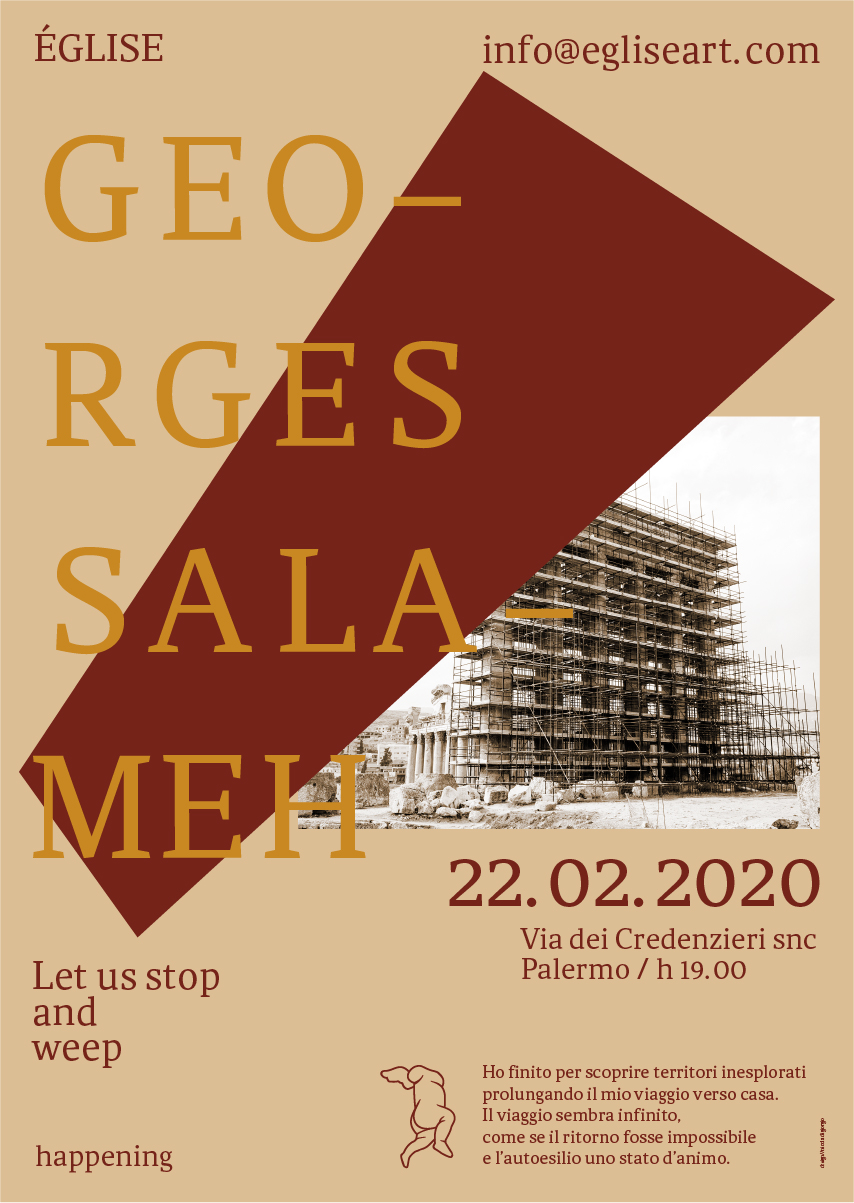 Il 22 febbraio 2020, alle ore 19, a Église si terrà l’happening fotografico Let us stop and weep con Georges Salameh. All’interno della piccola chiesa per una sola sera, sarà realizzata un’installazione intorno alla quale il fotografo racconterà il suo progetto Let us stop and weep.