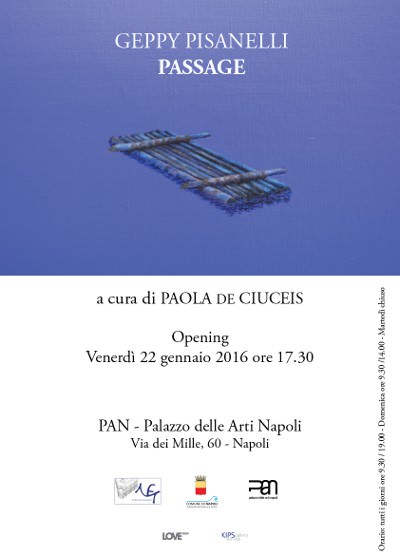 Venerdì 22 gennaio, ore 17.30, per la stagione artistica in corso, Fondazione Mannajuolo e Al Blu di Prussia presentano al PAN, Palazzo delle Arti Napoli ( via dei Mille 60), "Passage" personale di Geppy Pisanelli a cura di Paola de Ciuceis; un'iniziativa realizzata in collaborazione con l'assessorato alla Cultura e al Turismo del Comune di Napoli.