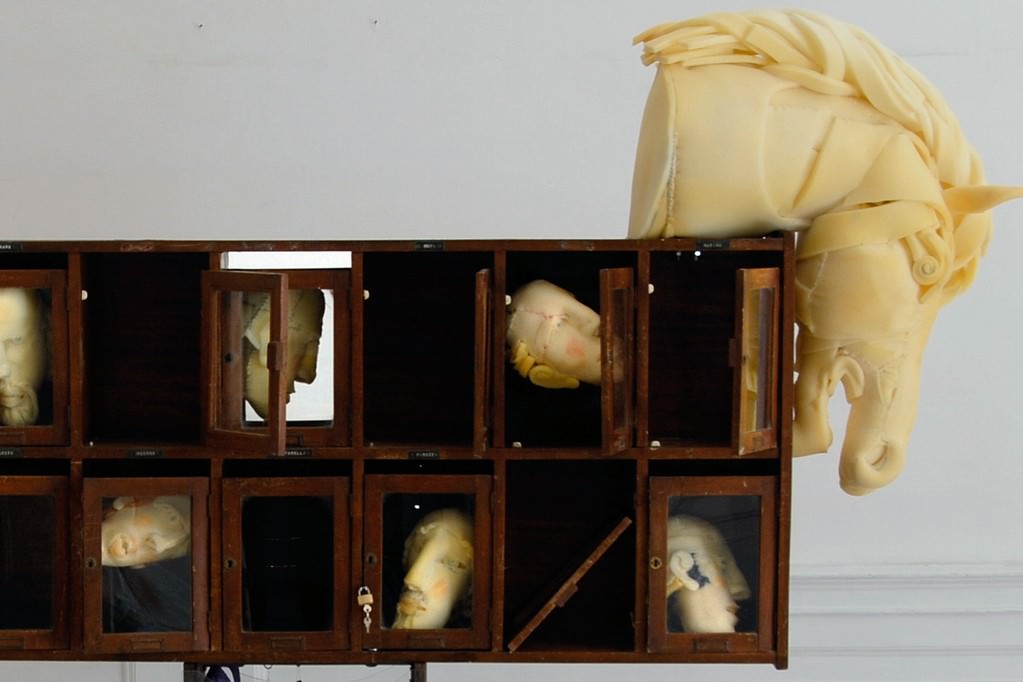 Dramma ed ironia, vita e morte, evocata durezza eternatrice del marmo ed effettiva flessuosità effimera della gommapiuma: nel solco di tali contrapposizioni dialettiche si sviluppa il discorso della nuova mostra personale di Gerardo Di Fiore. “C’è posta per Troia” funziona come una sorta di beffarda traduzione in chiave quotidiana della celebre vicenda del cavallo ligneo narrata da Omero: persino delle banali cassette delle lettere di un condominio, qui fungenti da corpo del cavallo, possono celare minacciose quanto insospettabili insidie. “Guardando ai nuovi mercati” costituisce, pur adoperando sempre e comunque un registro dai toni ludici, una cosciente denuncia contro la mercificazione dei corpi viventi, specie minorenni. “Il riposo di Bacco” innesca un cortocircuito tra l’indole del personaggio al quale è dedicata, depositario per eccellenza dello “spirito dionisiaco”, ed il suo stato di insolito rilassamento. “Oxigen” si fonda sulla paradossale sostituzione della respirazione dell’aria, indispensabile per la vita. L’operazione di maggiore impatto, dalla quale trae il titolo l’intera mostra, è però senz’altro “Parnassus”, dal monte venerato nell’antica Grecia: si tratta di un’installazione in gommapiuma dove convivono thànatos e eironeía.
