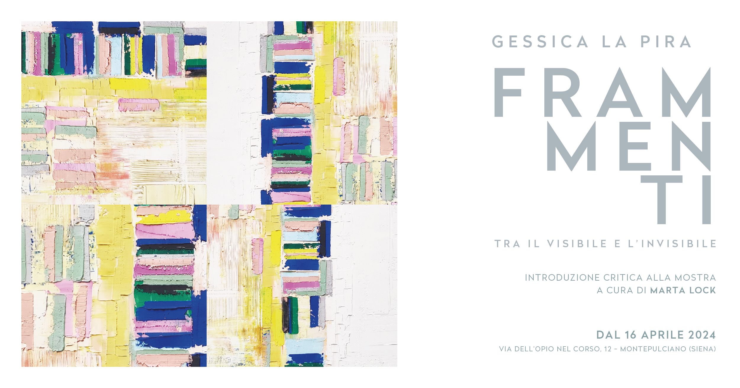 Sarà inaugurata martedì 16 aprile a Montepulciano, via dell'Opio nel Corso n. 12, la mostra sulla produzione più recente di Gessica La Pira, artista toscana di origini siciliane che è stata inserita nell'edizione 2024 dell'Atlante dell'arte contemporanea edito da Giunti Editore in collaborazione con Start Group e patrocinato dal Metropolitan Museum of Art di New York. Le nuove opere escono dal silenzio vibrante del bianco puro e inseriscono collage, tra immagini e parole, e pennellate intense di colore vivido e vivace, determinando quella rottura da parte della realtà del calmo e armonico equilibrio dell'interiorità dell'artista. I temi sociali, la perdita dei valori e la figura della donna sono al centro della ricerca attuale di Gessica La Pira, che da un lato ha bisogno di confrontarsi con gli eventi che la circondano ma dall'altro non può fare a meno di chiudersi nella dimensione della bellezza e della serenità per mantenere il proprio bilanciamento interiore.