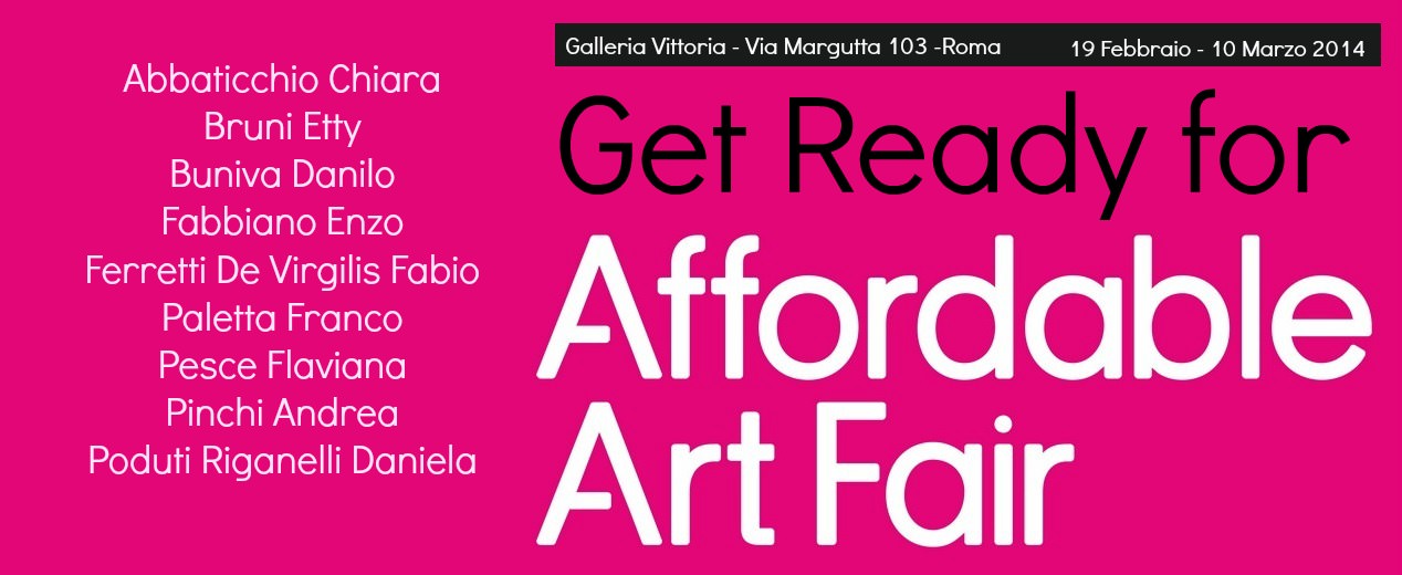 Il 19 febbraio vi aspettiamo alle 18.00 in galleria, via Margutta 103, per la mostra collettiva “Get Ready for Affordable Art Fair”, un’anteprima per il pubblico romano in cui esporremo gli artisti che presenteremo nel nostro stand durante la fiera Affordable Art Fair di Milano dal 6 al 9 Marzo