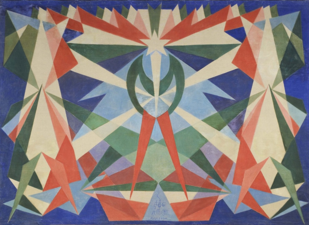 Impostato sui colori italiani del rosso, del bianco e del verde, che si intarsiano su un fondo blu e azzurro, la composizione “prismatica” è incentrata su una schematica figura d’uomo, la testa a stella, simbolo dell’Italia.