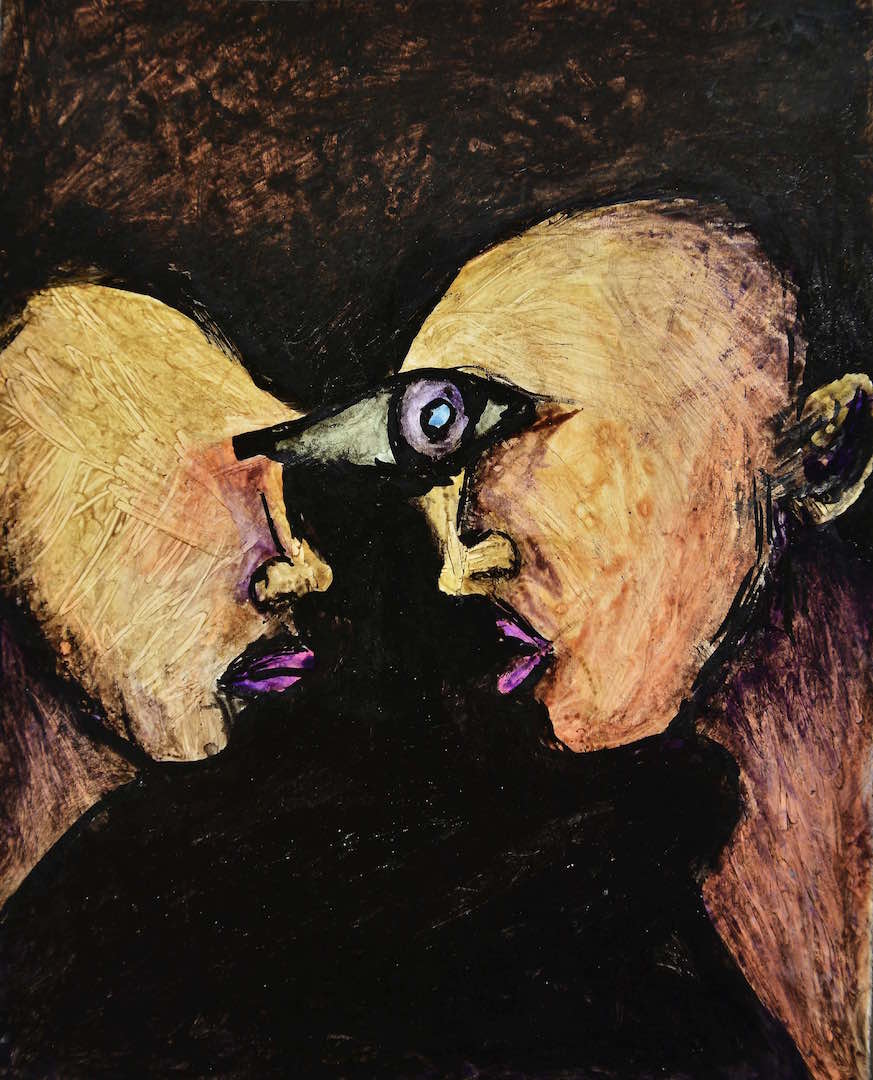 In particolare, i ritratti, che possono essere riuniti a gruppi, come a studiare l’abbozzo di volto che vi è dipinto da varie angolature o in varie torsioni dolorose (come appunto fu caratteristica di Bacon), hanno una forza comunicativa scioccante: A volte i lineamenti dei volti dipinti sono negroidi, grande rilevanza è data alle labbra e agli occhi, tristi, violacei, schiacciati nell’iride. Il viso si storce come in Tre studi di figure per la base di una crocifissione (Bacon): a volte la testa è al contrario sul collo, a volte il viso, di profilo, schiacciato in modo innaturale, spesso gli occhi sono uno solo, in un non finito che risulta, paradossalmente, del tutto completo. La componente animale è fusa alla componente umana, con una netta prevalenza della bestia sull’uomo. L’espressionismo mostruoso e straniante di Ghezzi si rivela in modo enigmatico in queste opere in mostra al Calisto Cafè di Vailate, dove l’essere umano è straziato, allo spettatore immaginare se da drammi esistenziali e interiori, o dall’azione coercitiva e torturatrice dell’ambiente al limite della mutazione antropologica e genetica.