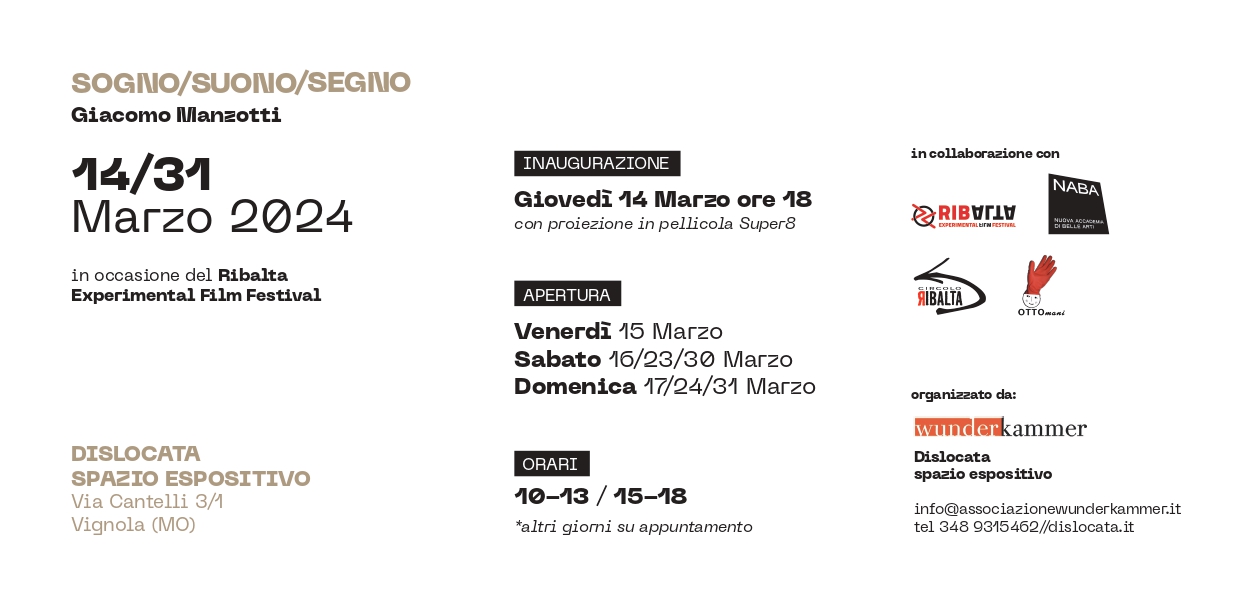 In collaborazione con Ribalta Experimental Film Festival (Vignola, 14 - 17 marzo 2024) Dislocata festeggia i primi 10 anni di apertura con la prima mostra personale di Giacomo Manzotti, dal 14 al 31 marzo.