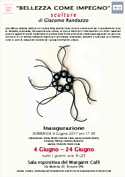 Domenica 4 Giugno 2017 alle ore 17.30 sarà inaugurata presso il Margaret Cafè, in Via V. Madonia 93 a Terrasini, la mostra di sculture di Giacomo Randazzo intitolata “Bellezza come impegno”, promossa e curata dall’associazione Asadin con testo di presentazione di Evelin Costa.