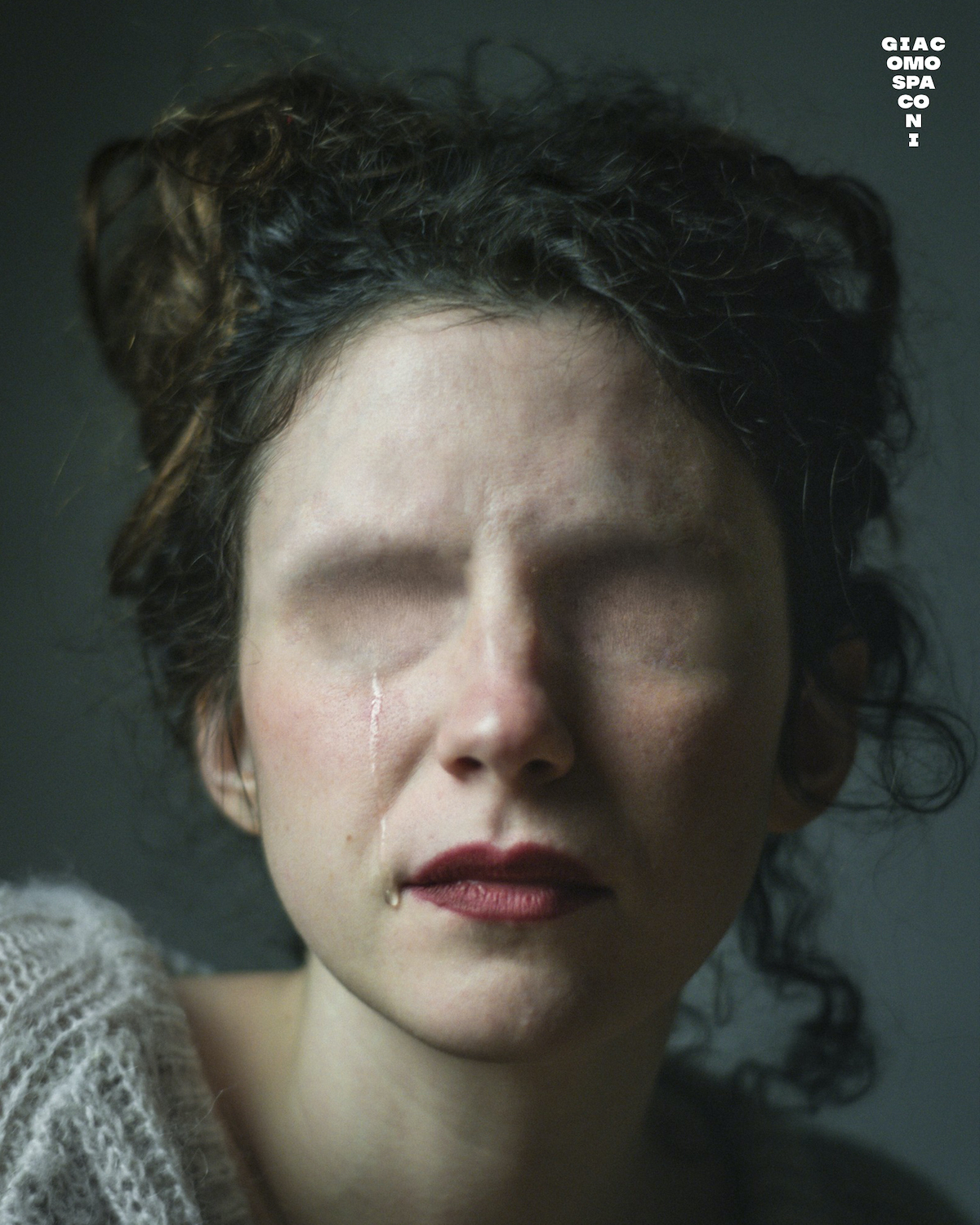 I volti immortalati da Giacomo Spaconi risultano impersonali, senza identità ma non paiono in attesa che degli occhi riempiano i vuoti o che qualcuno indossi la maschera di carne. O, se anche fossero in attesa, non lo comunicano ad anima viva, non lanciano SOS. Sono dei fantasmi con le palpebre cucite attraverso un attento e calibrato lavoro di grafica 3D iperrealistica. E qui si compie ancora lo scarto: se i punti di sutura fossero esplicitati potremmo pensare a un'aggressione, una violenza perpetrata a loro danno, un atto di un sadico carnefice o a un incidente irreversibile. Ciò ci spingerebbe a provare compassione, a immedesimarci, a dis-porci nella pelle dell’altro. Tutte queste considerazioni non si attivano, al contrario, le immagini ci respingono nonostante dei gesti richiamino e facciano percepire calore umano: una lacrima riga la guancia di una donna, una mano cinge quasi per massaggiare il retro di un collo taurino, un’altra mano accoglie teneramente un volto femminile.