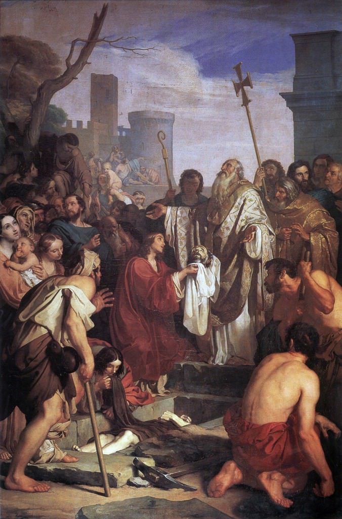 Trécourt racconta l’episodio con una sapiente regia: fulcro patetico della composizione è l’impressionante scorcio del cadavere racchiuso nel gelido avello di pietra da cui, con un gran colpo di teatro, viene innalzato il volto esangue del martire. Tutto intorno si dispiega una folla concitata di oltre trenta comparse, ciascuna fissata dall’artista in una diversa, e “naturalissima” reazione: alla gestualità enfatica di S. Ambrogio fanno da contrappunto la commozione delle donne che stringono i bimbi al seno, l’indifferenza degli scavatori, la sorpresa del mendicante, lo stupore che diventa preghiera.