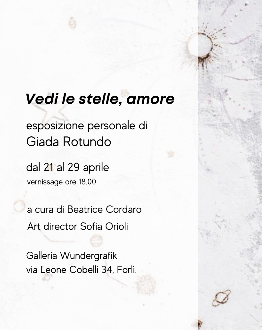 Dal 21 al 29 aprile 2023 sarà possibile vedere l’esposizione personale Vedi le stelle, amore di Giada Rotundo, a cura di Beatrice Cordaro, presso la galleria Wundergrafik in via Leone Cobelli 34, Forlì.