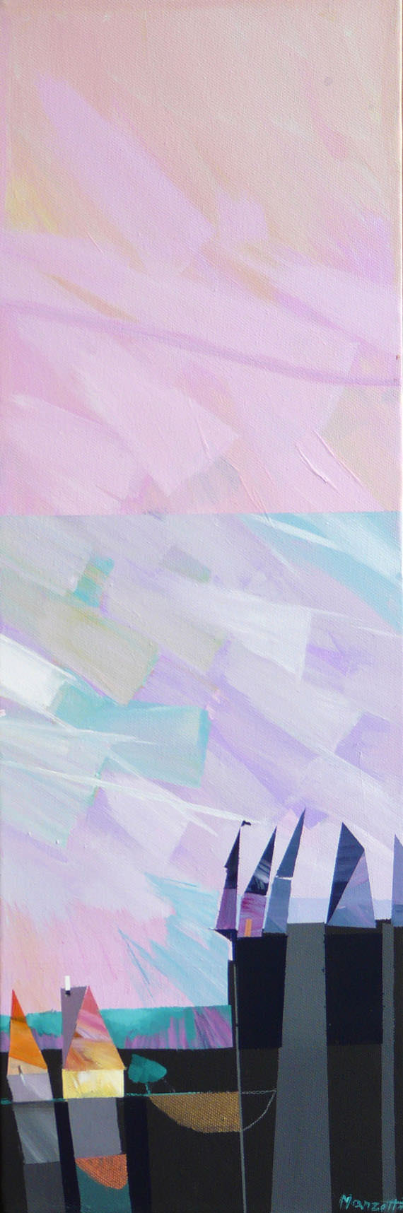“La poetica artistica di Alberto Manzetti, fondata su un’esperta capacità di sintesi, si caratterizza essenzialmente per il contrasto, che assume diverse sfaccettature. Nelle sue opere, dove ogni elemento è un progetto di architettura, di spazio, troviamo, infatti, una combinazione di toni caldi e freddi, scaturita da una componente esclusivamente istintiva. Una dicotomia tra progettazione e immaginazione quindi, dove quest’ultima assume un aspetto prevalente. L’equilibrio cromatico che l’artista crea nasce, paradossalmente, da tecniche di contrasto: il volume, la profondità e la scansione dei piani non sono ottenute con la prospettiva o con il chiaroscuro, ma sono del tutto affidati ai colori, che rivelano un elemento puramente emotivo, un gioco cromatico in grado di creare un piacere visivo. La contrapposizione tra campiture nette e squillanti, materiche, elementi geometrici, ritmi serrati e colori sfumati e spazi bianchi, sembra approdare a una sintesi tra il Cubismo sintetico di Picasso e il Cubismo Orfico di Delaunay e Lèger, dunque tra aspetti razionali e onirici. Manzetti presenta nel suo lavoro un approccio veloce, il che deriva dalla volontà immediata di fissare l’emozione, l’attimo, il sentimento e l’anima che il soggetto gli trasmette”. (Laura Cianfarani)