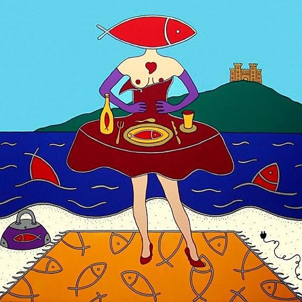 Atzeni nelle sue opere esprime la necessità di interrompere il flusso del vivere ordinario, per condurci sulle montagne russe in un paesino lontano, ove dall’alto si scorgono scenari poliedrici, in cui la nostra percezione delle cose si modifica. Quello che osserviamo sono mondi fantastici, dove anche gli oggetti più strani dialogano fra loro, raccontando storie che ci appartengono. In ogni storia è presente un’immagine legata al cibo o alla tavola: pesci rossi, banane, mele, ma anche alimenti cucinati come i dolci. Questi “cibi” hanno però una forza simbolica tale, da esprimere più di un significato, coniugando così l’aspetto del nutrimento del corpo con il nutrimento dell’anima.