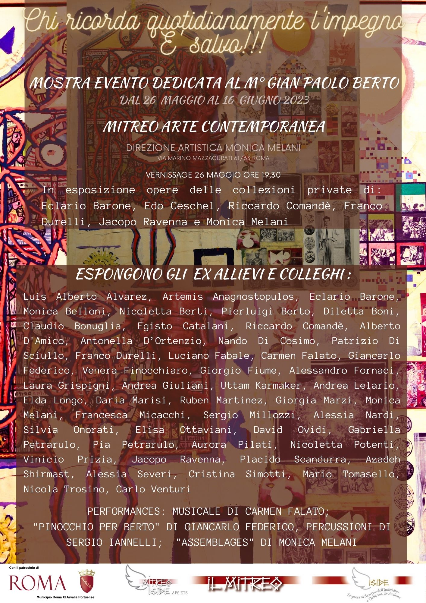 Mostra evento di pittura, scultura, fotografia, installazioni, grafica, video arte, poesia dedicata al Maestro Gian Paolo Berto, artista e docente presso l’Accademia di Belle Arti di Roma recentemente scomparso. In esposizione opere dei suoi allievi, amici e dello stesso Maestro.