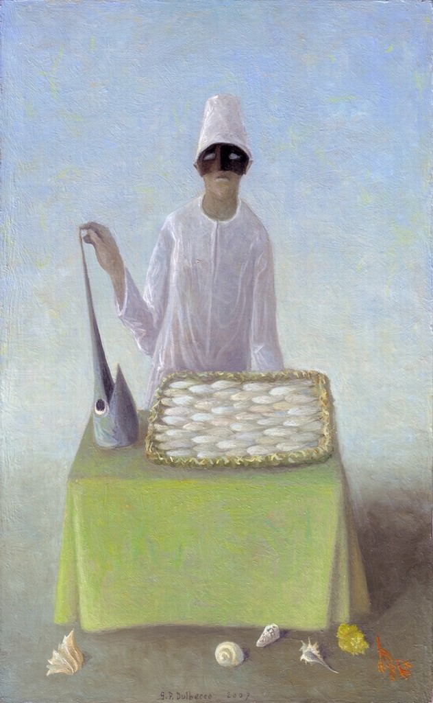 La prima esposizione è la mostra di Gian Paolo DULBECCO dal titolo "Mercati di sguardi". Pittore e artista dai mezzi qualitativi straordinari, che ora nel pieno della Sua maturità rivisita quel vicino passato adeguandolo all'occhio contemporaneo. Nel suo linguaggio pittorico forbito e raffinato, modulato sulle procedure tecniche della più aulica tradizione da cavalletto, fatto di delicatissime, pazienti velature e di impaginazioni sempre studiate anche quando appaiono semplificate, Dulbecco accentua e persino enfatizza la dimensione e l'atmosfera dello spaesamento, dell'interrogativo universale, impersonati dai protagonisti di questi suoi piccoli quadri: personaggi e maschere che scrutano il vuoto con espressioni fra l'ansia e la perplessità, leggono il responso delle carte si stringono in muti conciliaboli, ammansiscono rinoceronti dureriani, innalzano solitari concerti di flauto sulla soglia di architetture misteriose. I Pulcinella…custodi dei "mercati di sguardi".