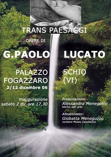Sabato 2 dicembre 2006 alle ore 17: 30 presso il Palazzo Fogazzaro a Schio (VI), si apre la mostra di Gian Paolo Lucato dal titolo Trans-paesaggi; questa mostra è composta da una trentina di fotomontaggi digitali tutti dello stesso formato, 60x90, realizzati nell’arco di tre anni tra il 2003 e il 2005. Sono stati realizzati accostando tra loro, secondo rigorose strutture compositive, foto di paesaggi domestici, frammenti di figure mitologiche ricavate da riproduzioni di opere antiche, e frammenti di testi poetici e letterari. Il tema trattato, suggerito dal titolo - TRANS PAESAGGI - è sviluppato attraverso differenti interpretazioni di un medesimo soggetto: il paesaggio, appunto. Con queste opere Gian Paolo Lucato ci porta ad assumere un atteggiamento meditativo: il mistero dietro il luogo comune rivela in verità i rapporti profondi tra forma naturale e cultura umana. Queste visioni digitali, così lontane dalla tradizione fotografica del documento e così vicine alle sperimentazioni dell’avanguardia surrealista, non sono né analitiche, né oggettive, ma assolutamente soggettive, romantiche, visionarie, mistiche, capaci di rivelare come paesaggio e memoria sia binomio altrettanto inseparabile quanto uomo e natura